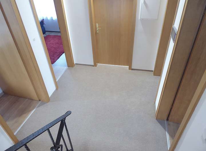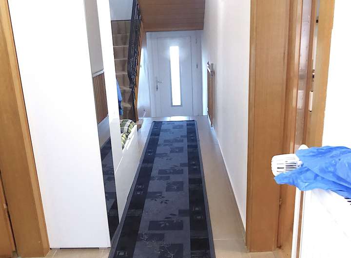 Beim Betreten des Hauses gelangen Sie über zwei Stufen und den überdachten Hauseingang in den einladenden Flur des Erdgeschosses, von dem aus Sie alle Räume dieser Etage bequem erreichen.