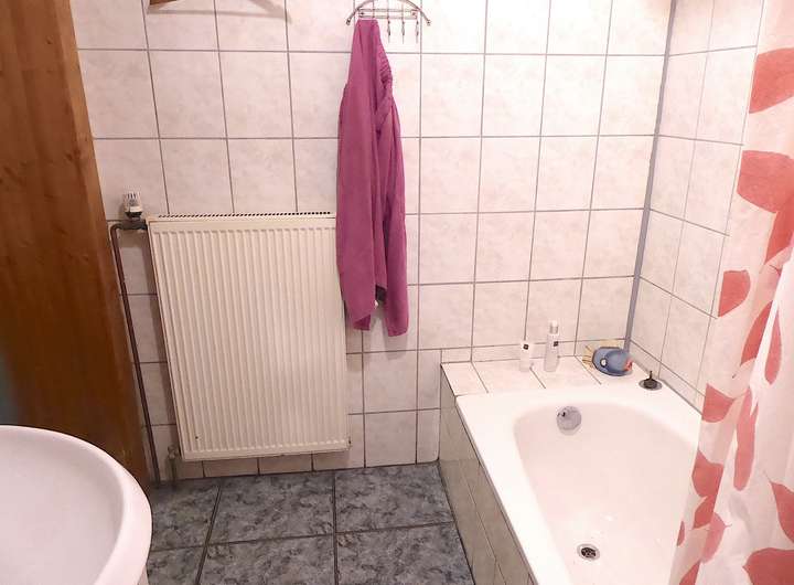 Das Haus bietet 126 m² Wohnfläche auf zwei Etagen. Im Erdgeschoss befinden sich ein helles Wohnzimmer (ca. 15 m²), ein Schlafzimmer (9,35 m²), eine Küche (9,52 m²) mit Zugang zur Terrasse, sowie ein Badezimmer mit Wanne (6,2 m²). Im Obergeschoss gibt es ein weiteres Wohnzimmer, ein Kinderzimmer, eine große Küche (20,2 m²), ein Badezimmer mit Dusche, und ein Schlafzimmer (17,5 m²). In beiden Etagen sind jeweils eine Toilette vorhanden. Alle Möbel und Küchen sind im Kaufpreis enthalten, so können Sie sofort einziehen. Das Dachgeschoss hat Ausbaupotenzial mit vorhandenen Anschlüssen. Der Keller ist teilweise unterkellert mit zwei Räumen und einer Ölzentralheizung.