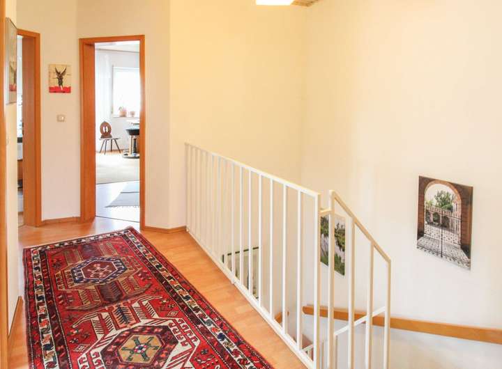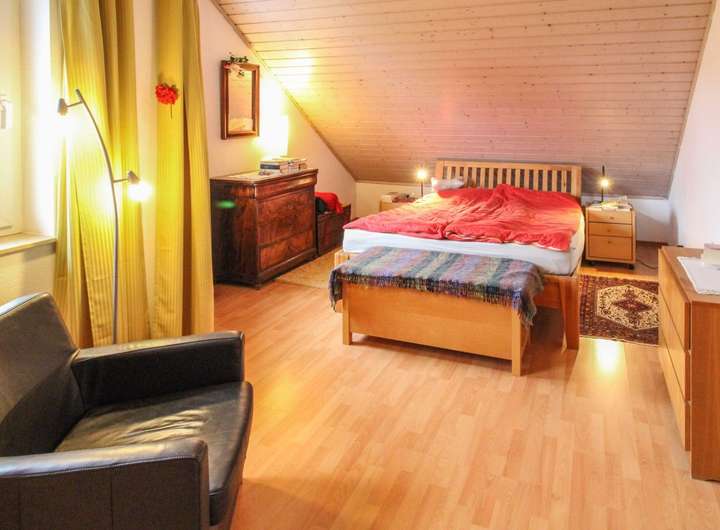 Über die gepflegte Innentreppe gelangen Sie in das Dachgeschoss, das – trotz leichter Schrägen – mit hellen, freundlichen Räumen überzeugt. Hier befinden sich das großzügige Elternschlafzimmer, ein Kinderzimmer sowie ein weiteres Zimmer für Büro, Gäste oder Ankleide, jeweils mit Zugang zum Balkon. Das große Tageslichtbad mit Dusche, Wanne rundet diese Etage ab.