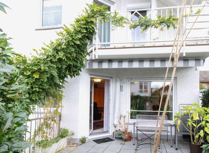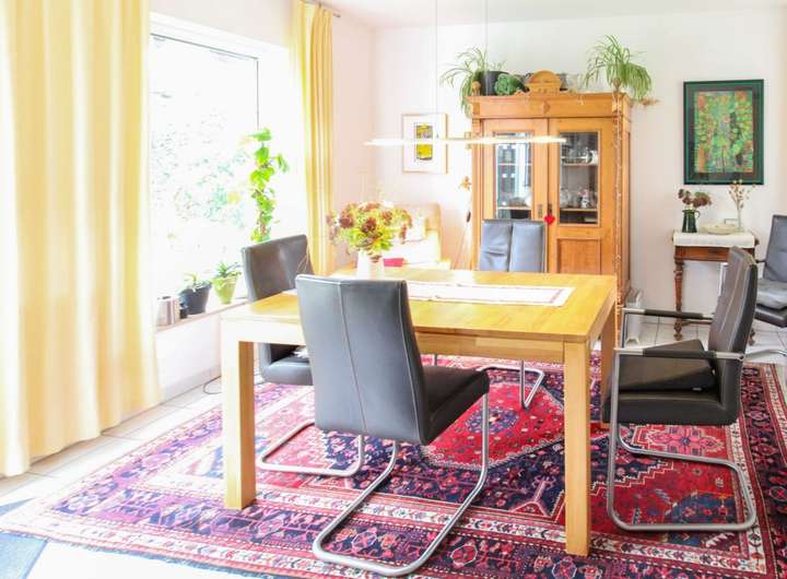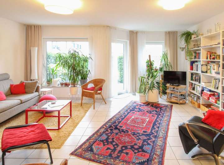 Hier erwarten Sie ein großzügiges Wohnzimmer mit bodentiefer Fensterfront und Zugang zur wunderbar bewachsenen, blickgeschützten Terrasse vor dem Haus, ein modernes Gäste-WC sowie eine großzügige Wohnküche mit Einbauten und Elektrogeräten. Angrenzend lädt das Esszimmer mit direktem Zugang zur zweiten Terrasse und zum gemütlichen Garten zu geselligen Stunden im Freien ein.