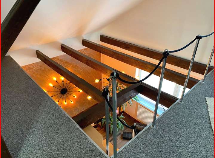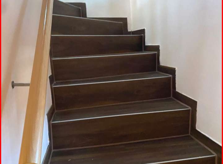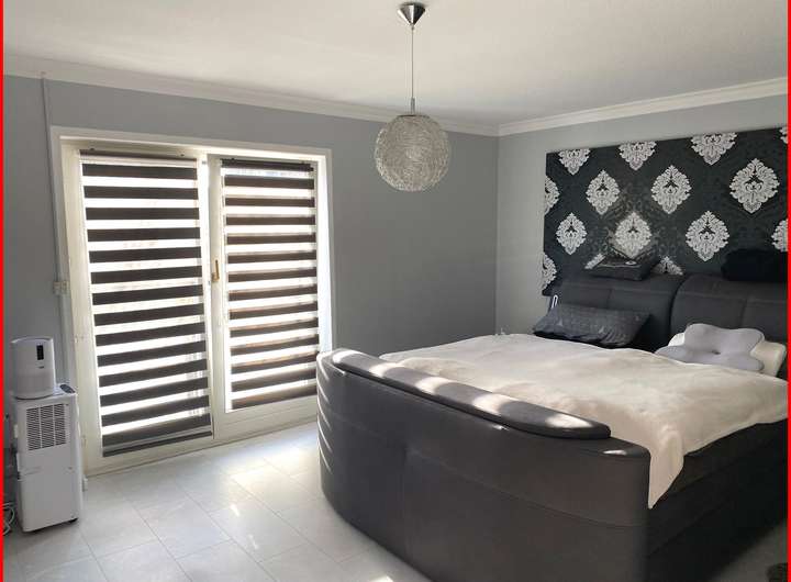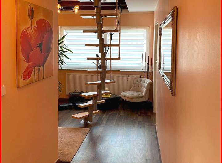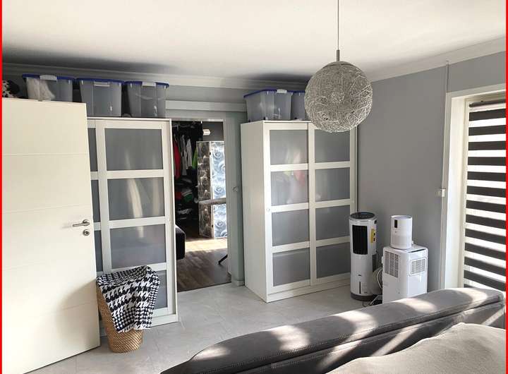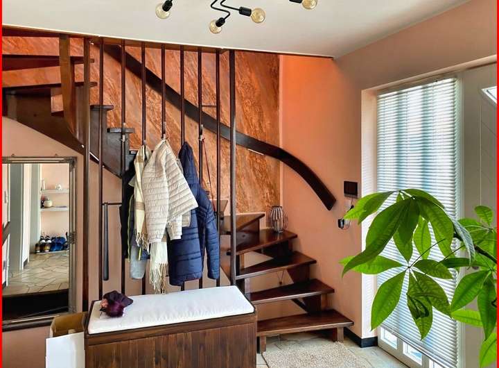Die Treppe im Eingangsbereich, schafft Eintritt zum Obergeschoss, dort trifft man auf das geräumige Schlafzimmer mit direktem Zugang zum Anziehraum, sowie Zugang zum Balkon. Außerdem einem weiteren Schlafzimmer und dem Bad mit Dusche.