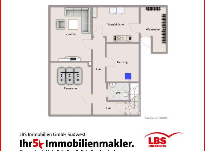 Im Kellergeschoss befindet sich neben einem Schlafzimmer, WC, Waschküche und einem Weinkeller, auch der Heizungsraum, sowie die Öltanks.