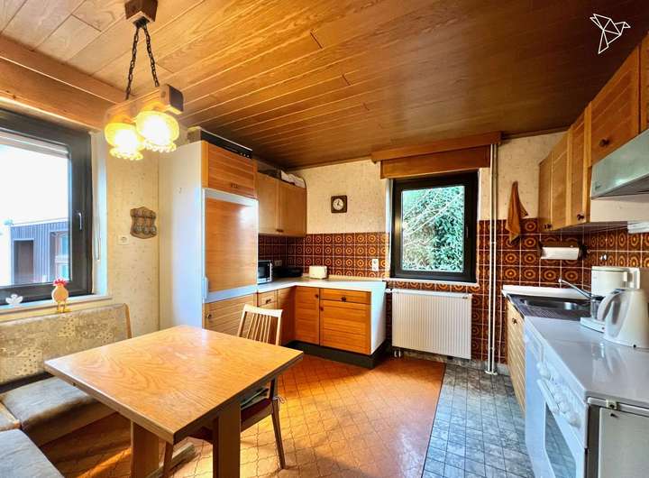 Die gut ausgestattete Einbauküche bildet das Herzstück des Hauses und bietet beste Voraussetzungen für gesellige Kochabende. Praktische Details wie Keller, Abstellraum, Garage und Außenstellplatz schaffen zusätzlichen Komfort und Ordnung im Alltag.