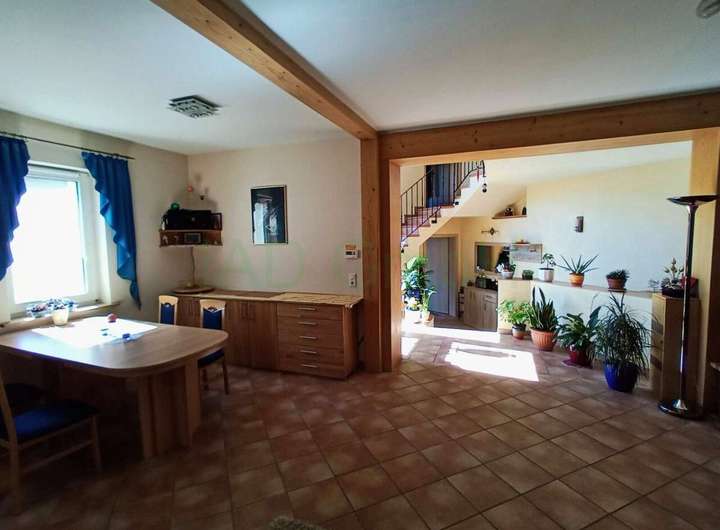 Um mehr Wohnraum zu schaffen, wurde das Wohnhaus geschmackvoll mit großen Fensterflächen und Sichtfachwerk mit dem Nebengebäude verbunden. Die Raumaufteilung im Inneren ist offen und großzügig gestaltet. Es gibt ein Wohnzimmer, ein Esszimmer, ein Duschbad sowie drei Schlafzimmer. Ein weiteres Bad könnte bei Bedarf noch eingerichtet werden.