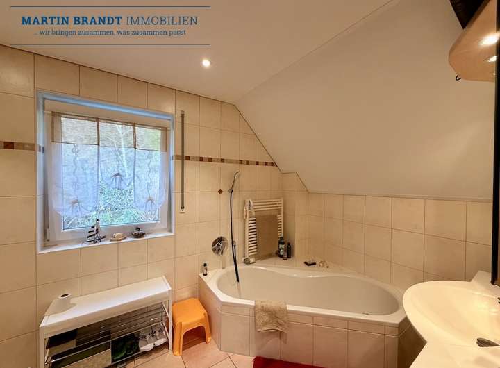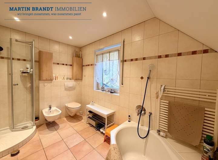 - Modernes Badezimmer mit Fenster, Dusche, Wanne, Bidet und WC