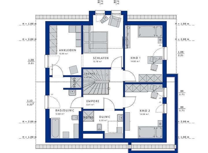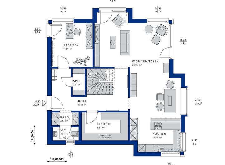 Dieses Einfamilienhaus punktet nicht nur mit seiner spannenden architektonischen Gestaltung, sondern auch mit seinem cleveren Raumkonzept. Im Zentrum des Entwurfs steht ein quadratischer Baukörper, an den sich ein Übereck-Erker und ein Querhaus anschließen. Mit seinem Flachdach steht Letzteres im Kontrast zum klassischen Satteldach des Haupthauses. Ausdrucksstarke Akzente setzen zudem die partiellen Holzverschalungen an den beiden Architektur-Bauteilen: Sie verleihen dem Fertighaus Gemütlichkeit und schlagen zugleich einen Bogen zur nachhaltigen Bauweise. Denn die Konstruktion hinter der schicken Fassade besteht zum großen Teil aus dem Naturbaustoff Holz, der im Innern ein angenehmes und gesundes Raumklima schafft. Ergänzt wird das Architekturkonzept von großzügigen Glasflächen in verschiedenen Formaten. Ins Auge fallen insbesondere die raumhohen Übereck-Verglasungen auf der Gartenseite, die die Grenzen zwischen innen und außen verschwimmen lassen. Der Eingang befindet sich auf der Giebelseite. Hinter der Haustür findet man sich in einer geräumigen Diele wieder, an die sich rechts die Garderobe, das Gäste-WC und der Technikraum anschließen. Links liegen ein helles Homeoffice, das wahlweise auch als Gäste- oder zusätzliches Kinderzimmer genutzt werden kann, sowie die Speisekammer. Geradeaus mündet die Diele in den lichtdurchfluteten Wohn-, Koch- und Essbereich, der rund die Hälfte der Erdgeschossfläche einnimmt. Große Freiflächen verleihen ihm einen luftig-leichten Charakter. Der Wohnbereich wurde über Eck angeordnet, sodass er nicht gleich vom Eingang aus eingesehen werden kann. Besonders praktisch ist der zweite Zugang zur Diele. Über eine halbgewendelte Treppe gelangt man in das Dachgeschoss, das sich als wahrer Wohntraum für eine Familie mit zwei Kindern entpuppt. Für den Nachwuchs stehen zwei gleich große Kinderzimmer bereit. So werden Streitigkeiten von vornherein vermieden. Ein separates Kinderbad mit Dusche sorgt für einen entspannten Start in den Tag. Die Eltern können sich über ein großes Schlafzimmer mit integrierter Ankleide und angrenzendem Wellnessbad freuen.