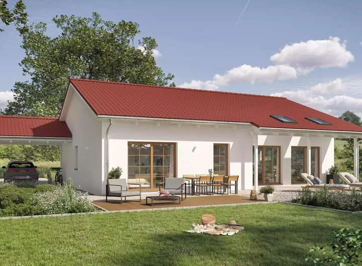 Der Entwurf "AMBIENCE 130". Mit den holzfarbenen Fensterrahmen, dem angebauten Carport und der Dachabschleppung, die sich schützend über die Terrasse legt, greift er spielerisch Elemente der klassischen Bauweise auf. Den modernen Wohnansprüchen folgend, lässt sich die gesamte Gartenseite mit großformatigen Fenstern ausstatten. Filigrane Sprossen betonen dabei den ländlichen Charakter des Fertighauses.
