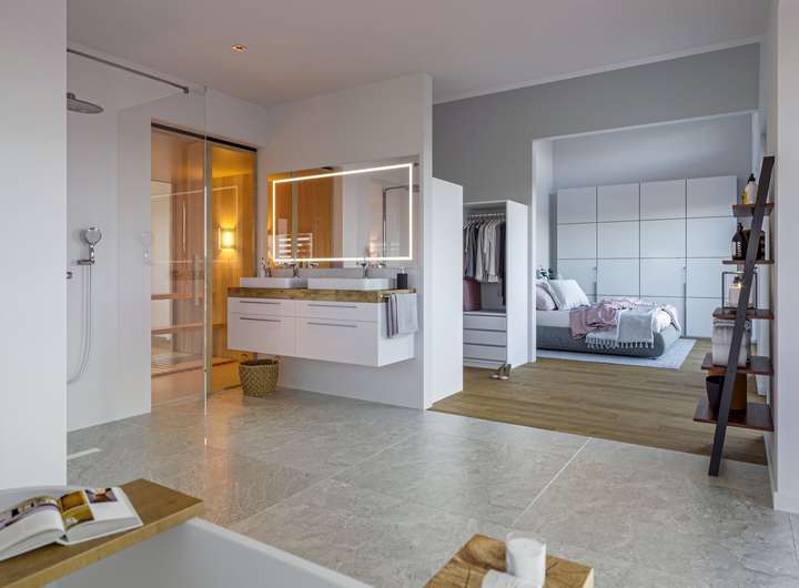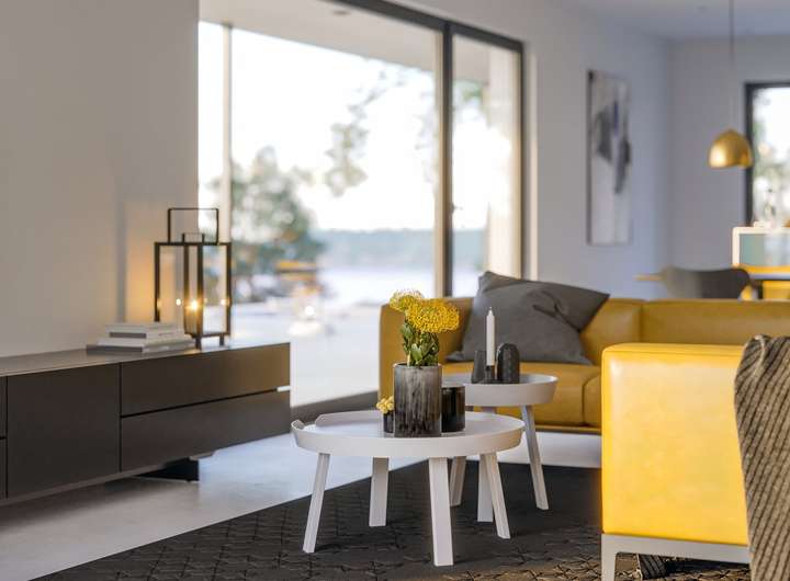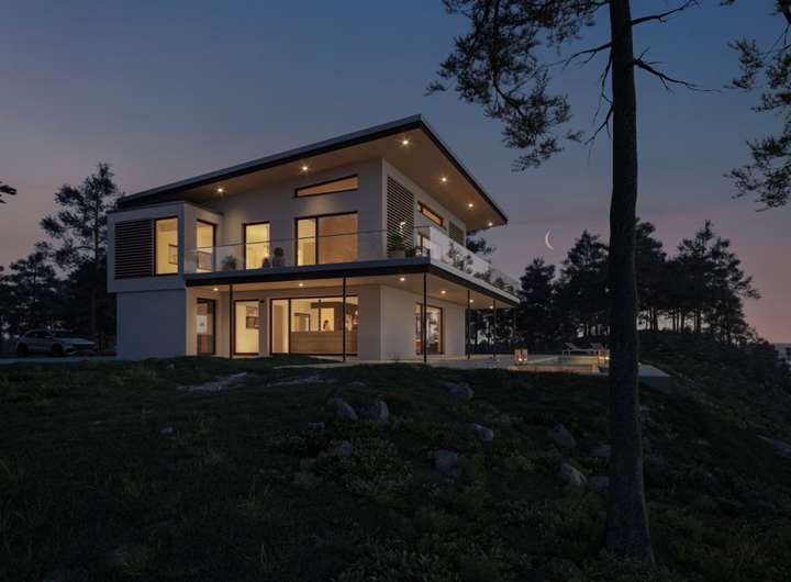 In dieses luxuriöse Pultdachhaus kann man sich nur verlieben: Mit dem umlaufenden Balkon, der vor dem Obergeschoss zu schweben scheint, und dem weit überstehenden Pultdach zieht es seine Betrachter sofort in den Bann. Attraktive Akzente setzen nicht nur die lamellenartigen Holzverschalungen, sondern auch die großzügigen Verglasungen, die von schmalen Lichtbändern bis hin zu raumhohen Glaswänden reichen. Sie öffnen das Fertighaus seiner Umgebung und bringen die Natur als eindrucksvolles Panorama ins Innere. Raffiniert sind die Oberlichter, die die Neigung des Daches aufgreifen. Die Raumaufteilung folgt einem durchdachten Konzept: Während sämtliche Funktions- und Nebenräume im Querriegel untergebracht sind, erstrecken sich die Wohnräume in Richtung Garten. Im Innern des Hauses werden die Besucher von einem repräsentativen Entree empfangen. Von hier aus fällt der Blick bereits durch die Gemeinschaftsräume - ohne zu viel davon preiszugeben — bis hinaus in den Garten. In die Hausecke schmiegt sich eine stylishe Treppe mit Podest. Gegenüber des Treppenaufgangs liegt der Eingang zum Homeoffice. Eintreten lohnt sich, denn über eine große Festverglasung blickt man direkt auf den langen Tisch im Essbereich. Dieser fungiert als zentraler Familientreffpunkt und verbindet den kulinarischen Bereich mit der schicken Couchlandschaft in Grau. Neben der modernen Kochinsel verbirgt sich ein kleiner Flur, der zum Gäste-WC und zum Technikraum führt. Das Obergeschoss ist eine wahre Wohlfühloase für eine vierköpfige Familie. An eine großzügige und luftige Galerie mit Leseecke schließen sich zwei Kinderzimmer, ein geräumiges Duschbad sowie der Elternschlafraum mit vorgelagerter Ankleide und Ensuite-Bad an. Absolutes Highlight ist die Sauna mit Glaswand zur Galerie. Jeder Raum - bis auf das Kinderbad - besitzt einen Zugang zum Balkon. Dabei hat jedes Familienmitglied seinen eigenen, uneinsehbaren Bereich. Eine Abstellkammer, die von außen betreten wird, bietet Stauraum für sämtliche Sitzpolster, Sonnenschirme und Klappliegen.