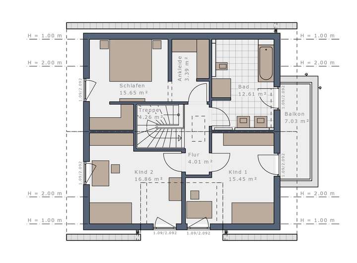 Die dargestellten Grundrisse verstehen sich als Beispiel/Vorschlag und können ohne Mehrkosten individuell umgeplant werden, insofern die Gesamtwohnfläche/bebaute Fläche gleich beleibt. Die Gesamt-Wohnfläche und Hausgeometrie/-Architektur kann gegen Preiskorrektur geändert angeboten werden. Die üblichen orts- und grundstücksabhängigen Bau- & Erwerbsnebenkosten sowie gewünschte Garagen/Carports sind hinzuzurechnen.