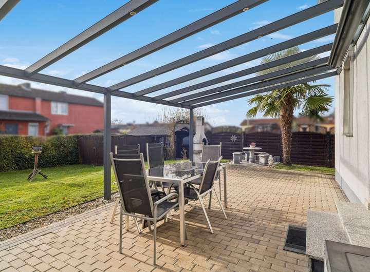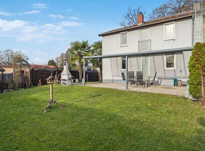 Im Erdgeschoss erwartet Sie ein großzügiger Wohn- und Essbereich mit Zugang zur sonnigen Terrasse – ein idealer Ort für gesellige Stunden im Freien oder entspannte Nachmittage mit der Familie. Von der Terrasse aus gelangen Sie direkt in den liebevoll gepflegten Garten, der mit seiner harmonischen Bepflanzung und ruhigen Atmosphäre ein echtes Kleinod im Alltag darstellt.