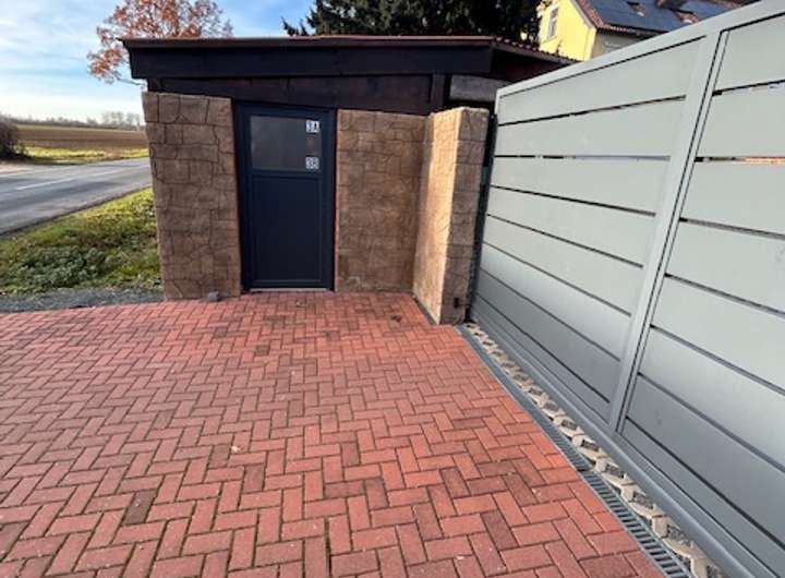 Das Grundstück ist vollständig von einer Natursteinmauer umgeben, die nicht nur Schutz, sondern auch eine elegante Optik bietet. Die Zufahrt erfolgt durch ein großes elektrisches Einfahrtstor, das Privatsphäre und Komfort miteinander verbindet. Ein Postlagerelement ist im Eingangsbereich zusätzlich vorhanden.