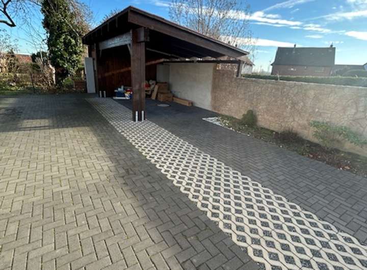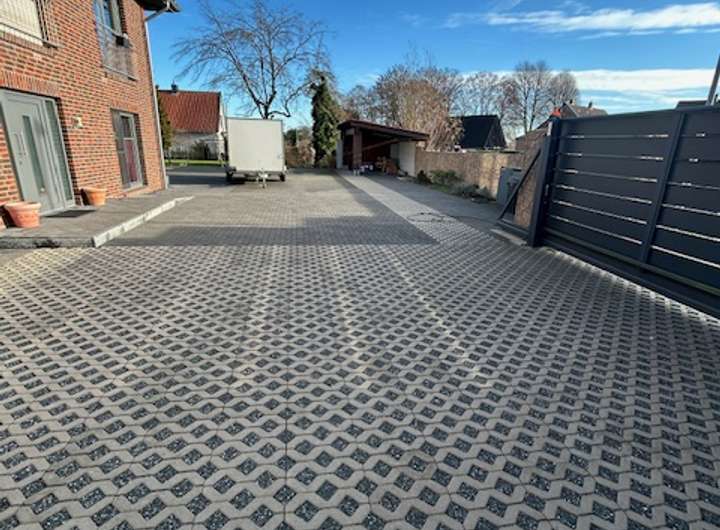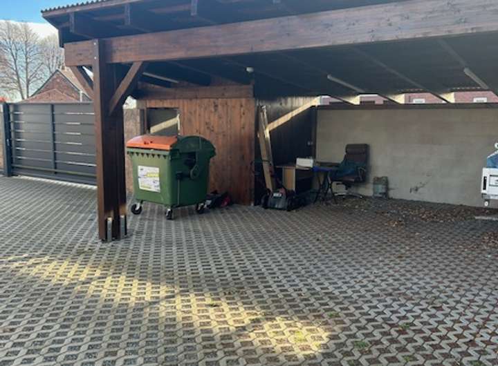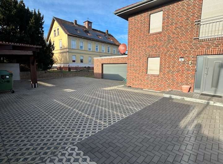 Der weitläufige Hofbereich bietet reichlich Platz für mehrere Fahrzeuge, Besucher oder gewerbliche Nutzung. Ein Doppelcarport ergänzt die Stellplätze optimal.