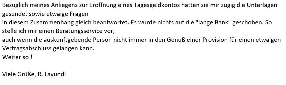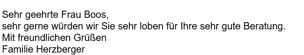 Ich möchte Ihnen an dieser Stelle bzw. diesem Wege gerne bestätigen, dass ich mich durch Sie bzgl. Bausparvertrag, Festgeldanlage etc. -geht ja schon einige Wochen - ausgezeichnet und umfassend beraten und unterstützt haben..... und wohl auch weiterhin tun   Danke !