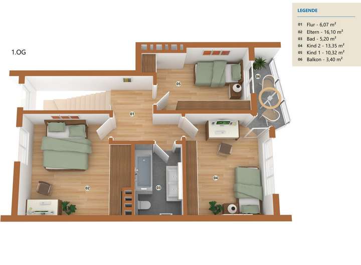 Im 1. Obergeschoss ist der Schlafbereich für die Familie. Sie finden dort 2 Kinderzimmer und ein Elternschlafzimmer mit extra Ankleidezimmer. Ein Badezimmer mit Wanne sowie ein kleiner Balkon sind ebenfalls vorhanden.
