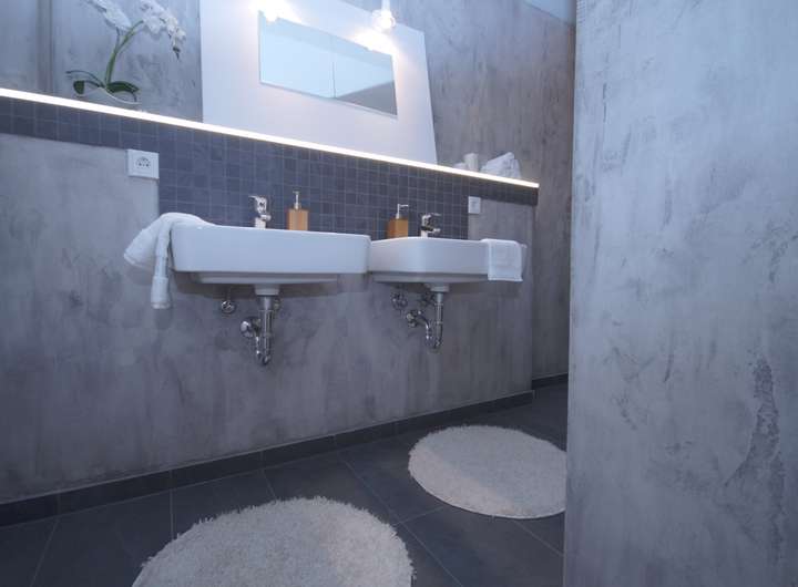 - das Familienbadezimmer mit Doppelwaschbecken und Badewanne, die mit LED Akzenten versehen ist, liegt im Obergeschoss