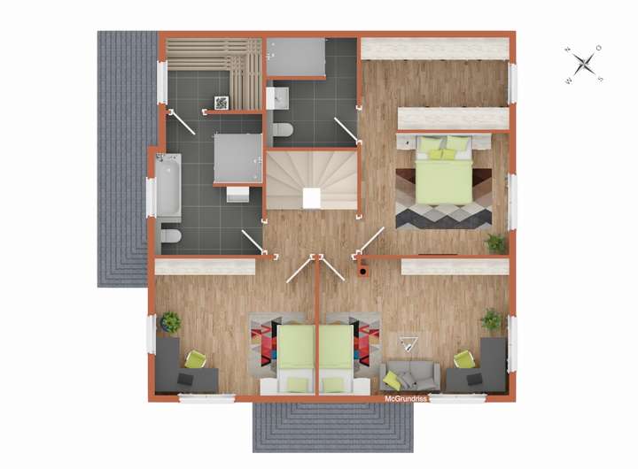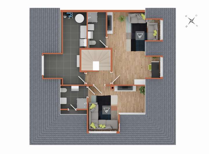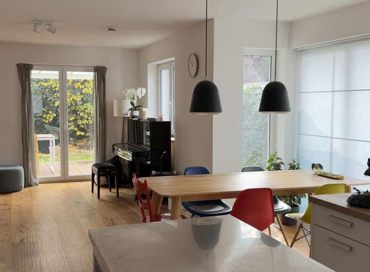 Das Haus wurde von regionalen Handwerksfirmen in hoher Qualität erstellt. Großzügige Fenster sorgen für Helligkeit im Haus. Im Erdgeschoss erstreckt sich der offene Grundriß für die Bereiche Kochen/Essen/Wohnen über ca. 50 qm Wohnfläche. Am Wohnzimmer angegliedert ist ein kleines Büro mit 9 qm. Neben der Küche befindet sich eine praktische Speisekammer. Eingang und Treppenhaus sind durch eine ca. 10 qm große Diele verbunden. Das große Dachliegefenster im Treppenhaus spendet Tageslicht in die Gebäudemitte. Im Obergeschoss befinden sich das Elternschlafzimmer mit separater Ankleide und Elternbad, zwei großzügige Kinderzimmer und ein 16 qm großes Bad. Die Bäder wurden mit Hansgrohe Markenarmaturen ausgestattet, die Duschen bodenbündig ausgeführt. Im Dachgeschoß sorgen die großen Gauben für Licht und Raum. Die betonierten Treppenläufe wurden mit masiven Eichenstufen belegt. Sämtliche Rollos sind elektrisch zu bedienen. Die umfangreiche Elektroausstattung beinhaltet eine große Anzahl an Steckdosen, Spots in der Küche und eine indirekte Treppenstufenbeleuchtung.