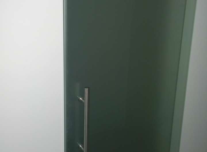 Das Bad ist durch eine moderne Glasschiebetür von den anderen Wohnflächen getrennt.