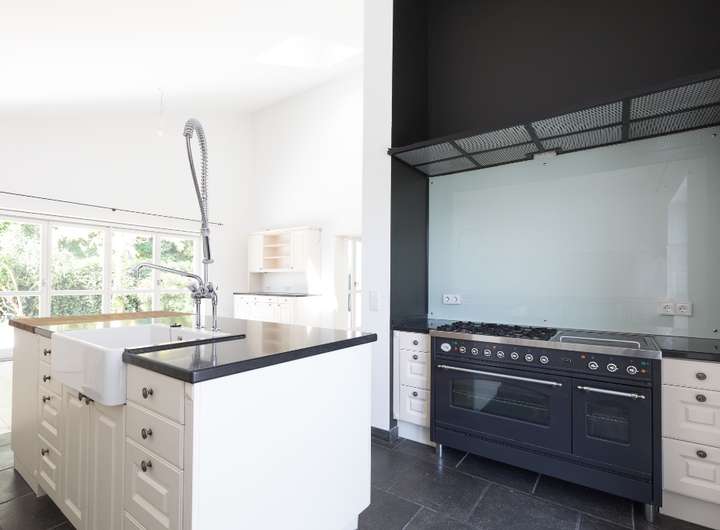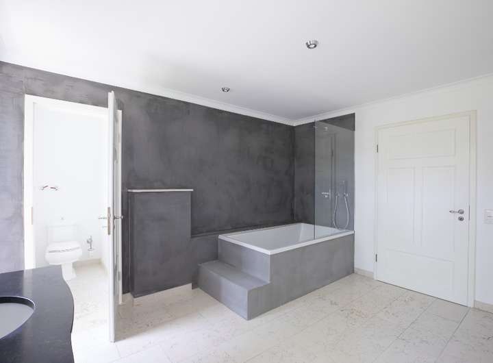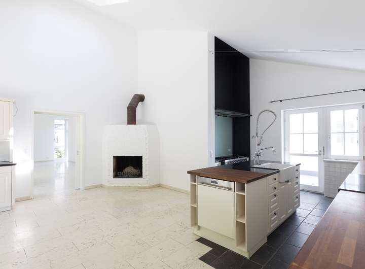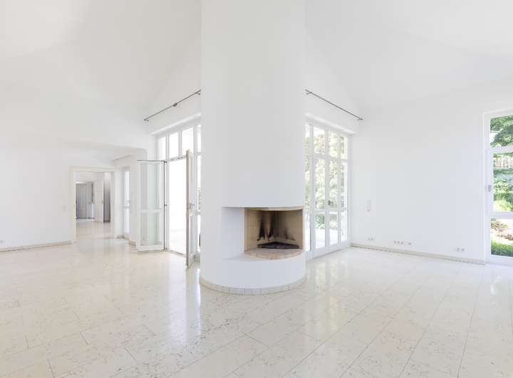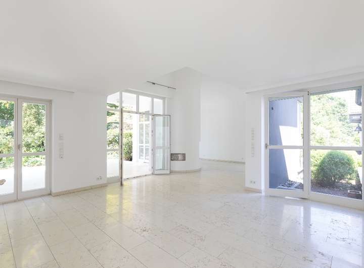Natursteinboden, Fußbodenheizung , bodentiefe Fenster, Kamin, Gäste-WC, überdachte Terrasse