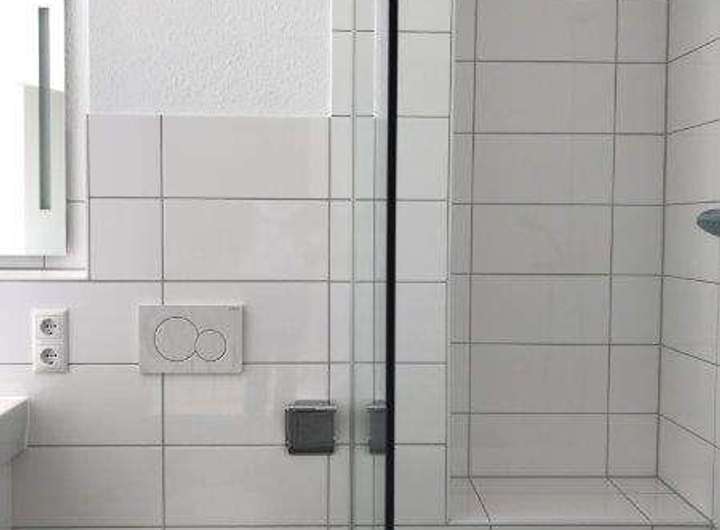 + in den Bädern 1. und 2. OG + Gäste-WC: anthrazitfarbener Fliesenboden, weiß glänzende, großformatige Wandfliesen (halbe Raumhöhe), alle Waschtische (3) mit Spiegel, Beleuchtung und Unterschrank, Glasduschabtrennungen/Kabinen
