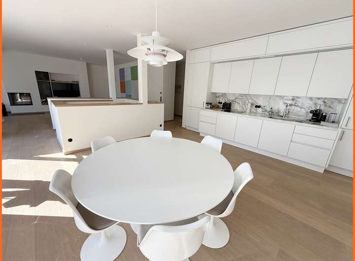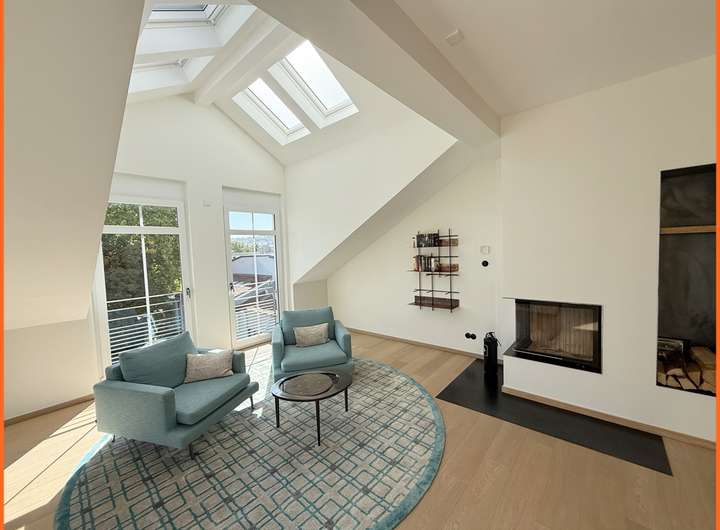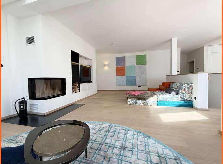 Das Herzstück der Wohnung ist das großzügige Wohnzimmer mit offener Designküche und stilvollem Kamin – ein Ort zum Ankommen, Genießen und Träumen. Durch die bodentiefen Fenster öffnet sich der Raum auf die große Südterrasse, wo Sonne, Licht und Grün eine harmonische Einheit bilden.