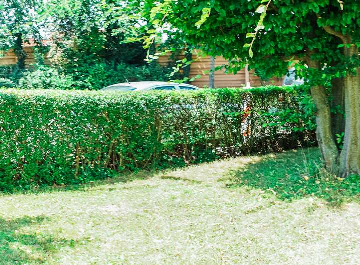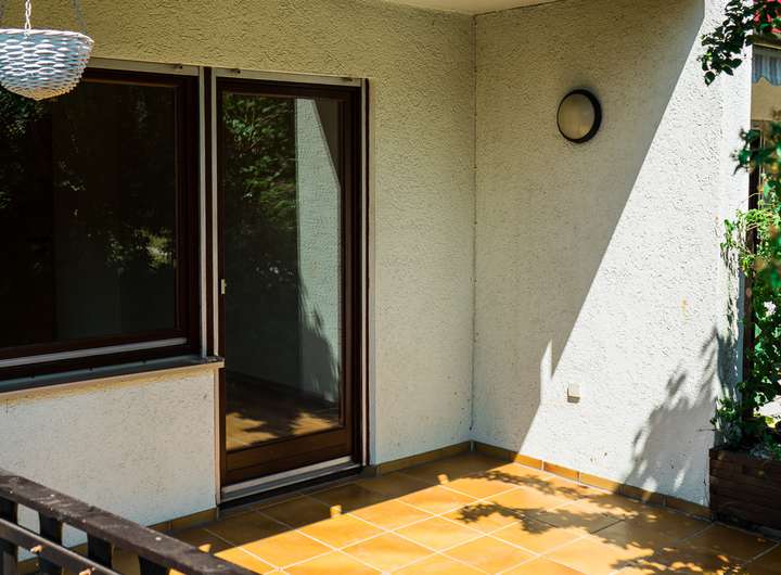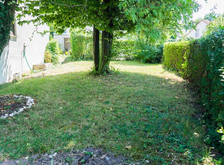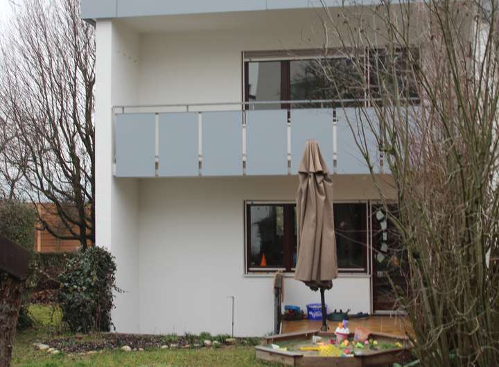 Auf dieser Etage befindet sich auch eine durch den Garten und die Hecke weitgehend blickgeschützte Terrasse. Von der Terrasse besteht Zugang zum Garten und zur Garage, im Garten befindet sich zudem ein Gartenhaus. Der Garten muss vom Mieter gepflegt werden.