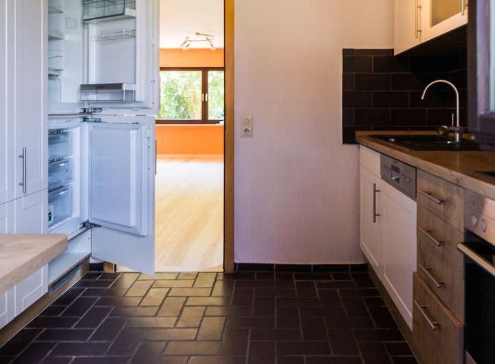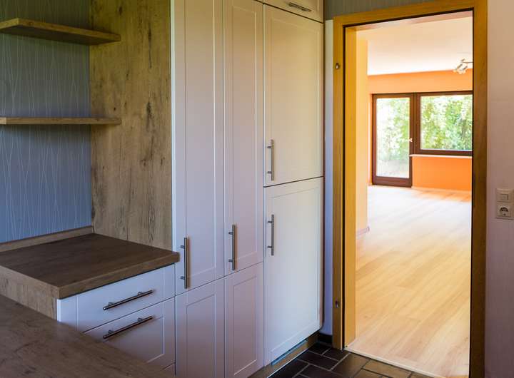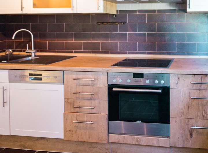 Die neuwertige Einbauküche ist mit Marken-Elektrogroßgeräten ausgestattet. Viele Schränke nutzen den Stauraum in der Küche optimal aus und bieten ausreichend Platz für die Vorratshaltung und Küchenutensilien aller Art.