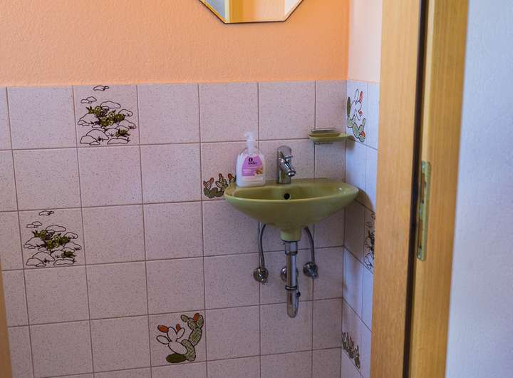In der oberen Etage befinden sich ein Schlafzimmer, ein Kinderzimmer, ein Balkon mit Gartenblick sowie ein Badezimmer mit Dusche und Badewanne, zwei Waschbecken und einem WC.
