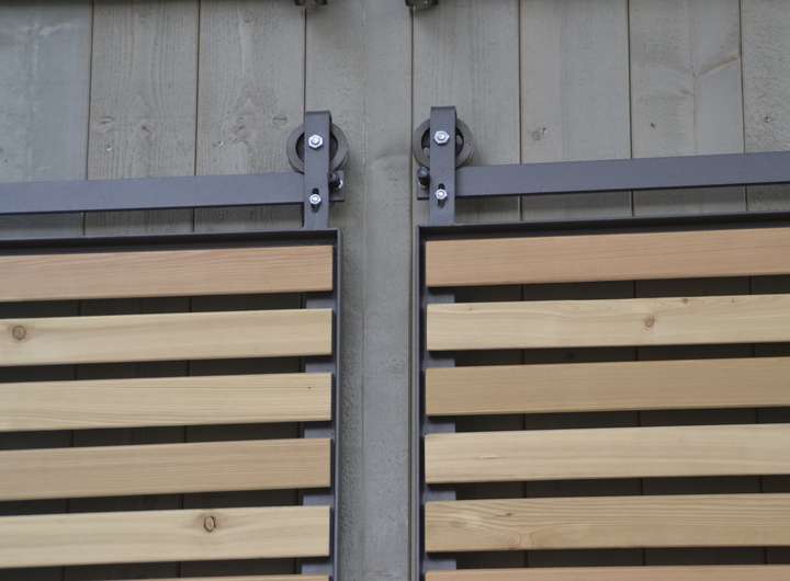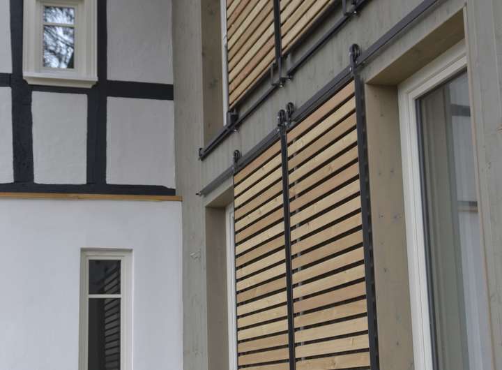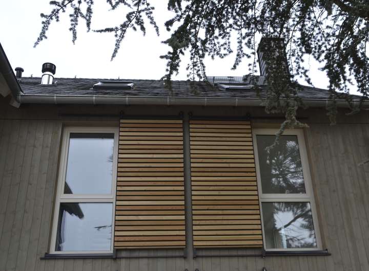 Im Sommer bewahren die äußeren Holzschiebeläden vor den großzügigen Glasflächen die Räume vor Überhitzung.