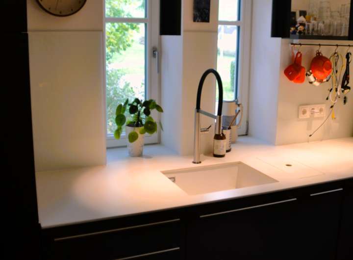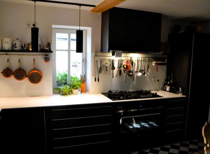 Moderne Wohnküche von LEICHT mit fünfflammigem Gasherd und 90-cm-breitem Ofen, großzügigem Kühlschrank (beides Siemens), Spülmaschine und Abzugshaube (Miele). Angrenzende Speisekammer mit Waschbecken, Nobilia-Küchenschränken und Wein-/Getränkekühlschrank.