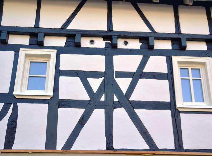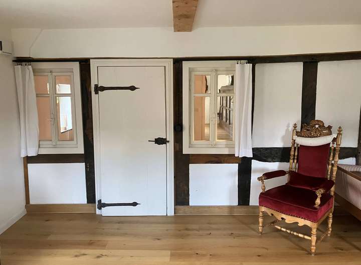 Im Fachwerkteil wurden aus statischen, aber auch aus Komfortgründen alle drei Decken erneuert und angehoben. Auch der gesamte alte Dachstuhl wurde erneuert.