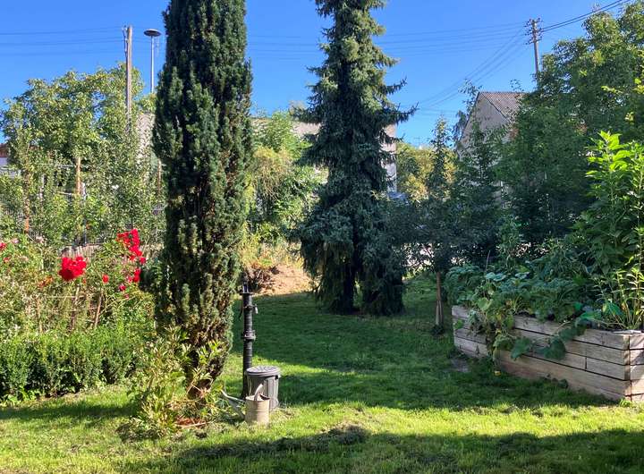 Regenwasserzisterne mit 5.000 l Flüssiggastank mit 6.400 l, beides im Boden vergraben. Romantischer Garten mit altem Baumbestand, neu gepflanzten Obstbäumen und -sträuchern, Hoch- und Staudenbeeten und vielen Strauch- und Kletterrosen.