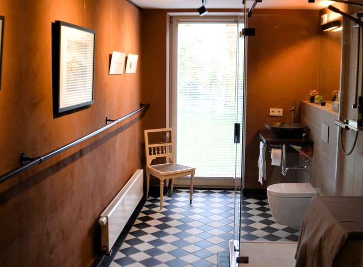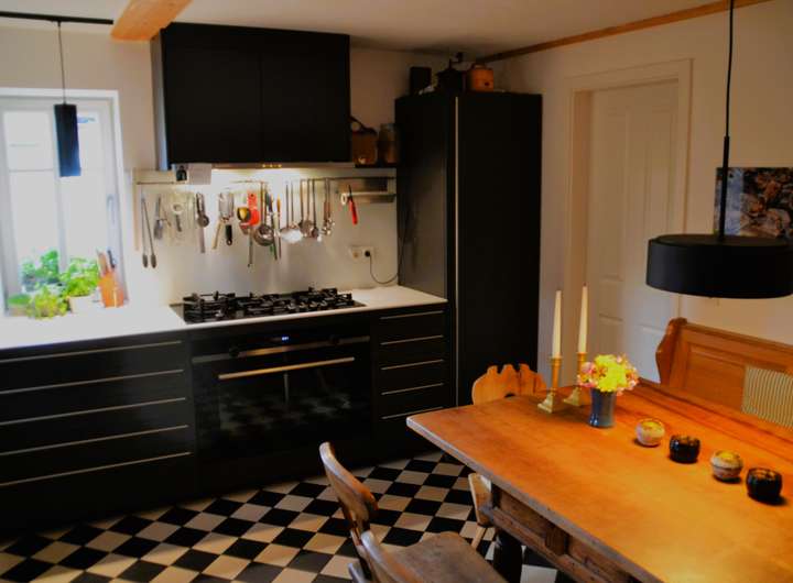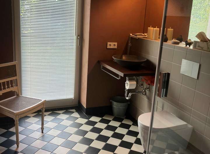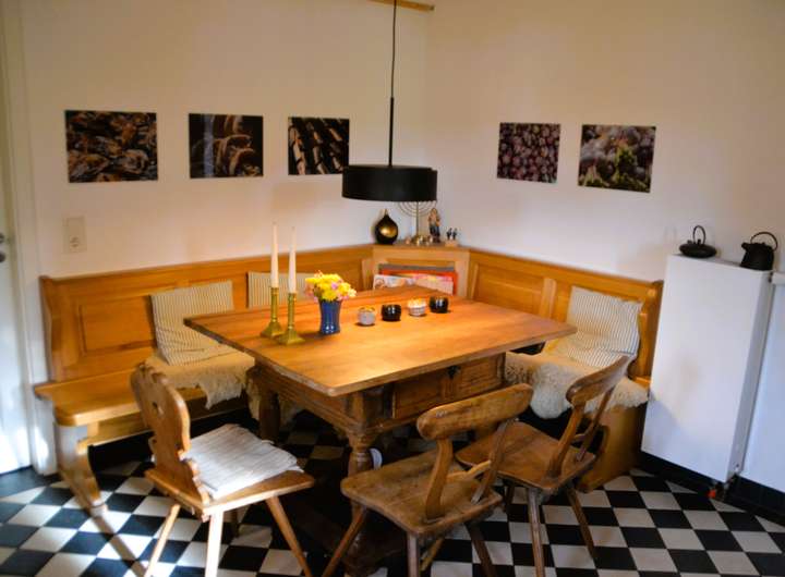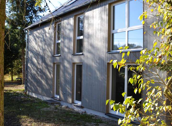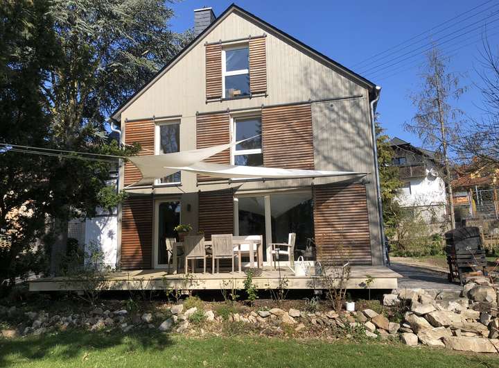 Fachwerk mit Lehmbausteinen saniert. Mineralische Außendämmung mit Holzverschalung oder Schieferverkleidung, im Fachwerkteil mit Calcium-Silikat-Innendämmung. Holzfenster und Holztüren, 3-fach verglast. Hochwertige Innentüren. Großzügige Terrasse aus langlebigem Accoya-Holz. Mineralputze und -anstriche innen.