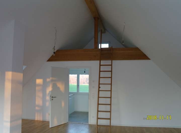 Im Dachgeschoss befindet sich eine großer Studioraum (36 m²) mit Überhöhe bis zur Dachuntersicht. Nach Westen schließt sich ein überdachter Balkon an, der im Winter einen Ausblick auf den See bietet. Ein weiteres Duschbad ermöglicht eine sehr flexible Nutzung des Hauses.