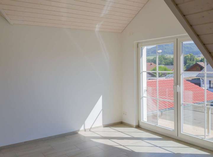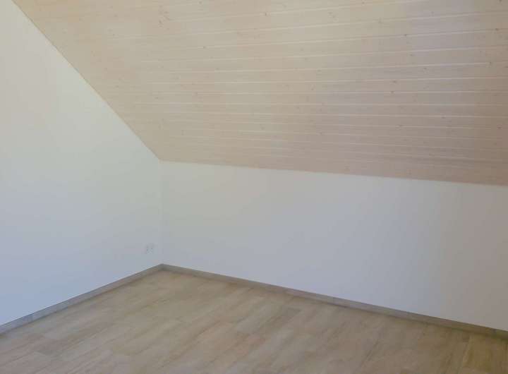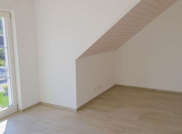 Über die schlicht und unaufdringlich in den Raum integrierte offene Treppe gelangen Sie in das OG des Hauses mit 3 Schlafzimmern, großen bodentiefen Fenstern und weiss gekalkten Holzdecken, sowie ein sehr geräumiges Bad mit 2 Waschbecken, einer begehbaren ebenerdigen Dusche, großen Badewanne und abgeteilter Toilette. Das Highlight des Bades ist die Gaupe, welche für sehr viel Tageslicht sorgt.