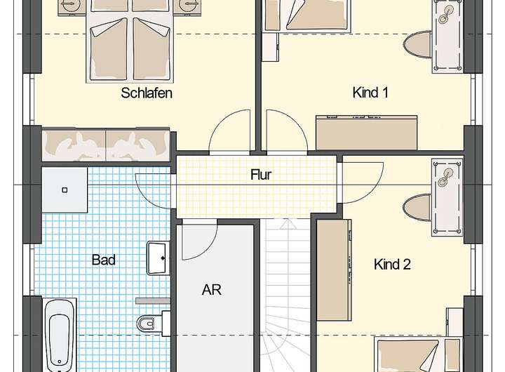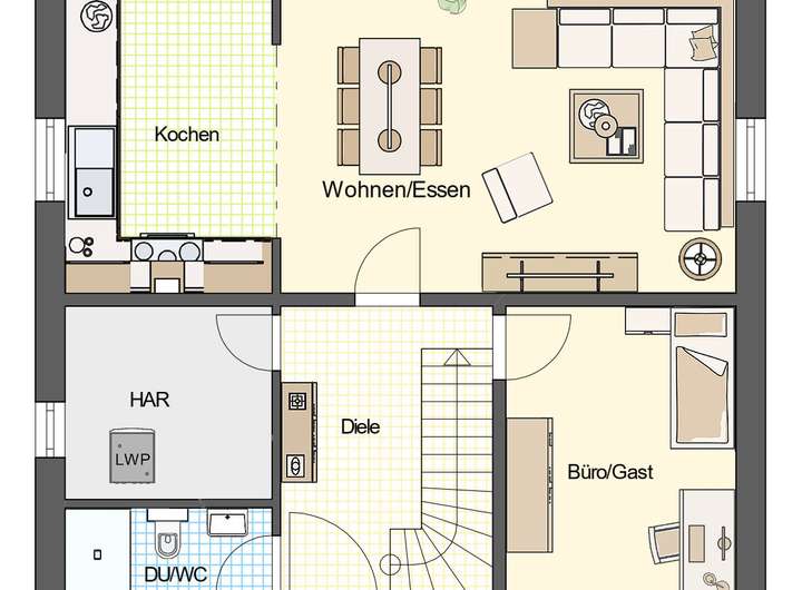 Bei allen vorliegenden Abbildungen und Fotografien handelt es sich um beispielhafte Darstellungen. Möblierungen und sonstige Einrichtungsgegenstände, Lampen, Außenanlagen, wie zum Beispiel Terrassen, Zuwegungen, Stellplätze, Carports, Pool und Gartenanlagen inkl. Bepflanzung sind nicht im Leistungsumfang enthalten. Der Leistungsumfang ergibt sich aus der jeweiligen individuellen Baubeschreibung des Hauses.