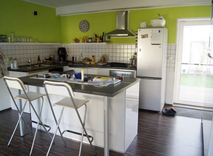 mit einer Einbauküche samt Kücheninsel und Geräten wie Kühlschrank,