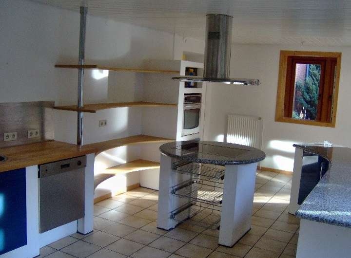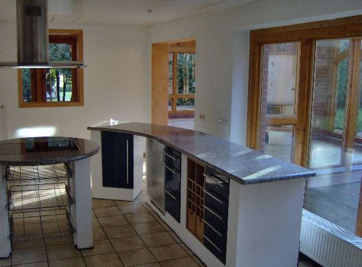 Gemauerte Küche mit einer Kochinsel, Dunstabzugshaube und Schränken sowie einem stilvollen Echtholzregal, einer Granitarbeitsplatte sowie einem Spülenbereich und großem Ceran- Kochfeld, aber sonst ohne Elektrogeräte (wie Kühlschrank, Spülmaschine, Backofen sowie Mikrowelle). Stellplätze für diese 4 Elektrogeräte sind vorgesehen (siehe Bilder - die dort installierten Geräte werden nicht mit vermietet).