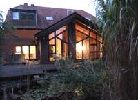 Wintergarten mit Balkenfachwerk und 4 Außentüren sowie elektrisch bedienbaren Dachfenstern.