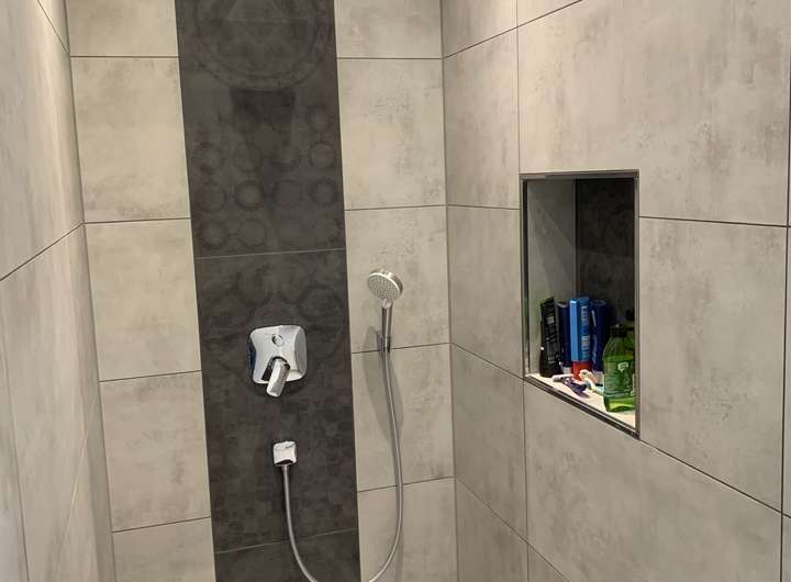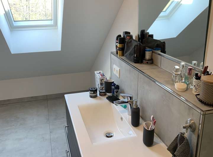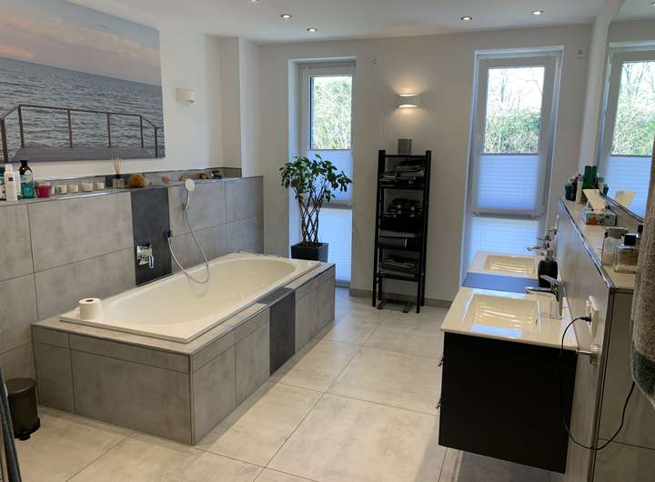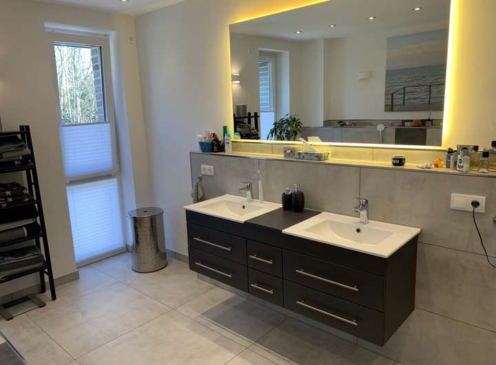 Das XXL Masterbad lässt keine Wünsche offen. Die Dusche ist Bodentief und als Walke In ausgelegt. 1A Doppelwaschbecken in Übergröße mit Unterbauschränken, indirekt beleuchteter Spiegel, Wandlampen, LED Decke sowie eine XXL Badewanne machen den Traum perfekt.