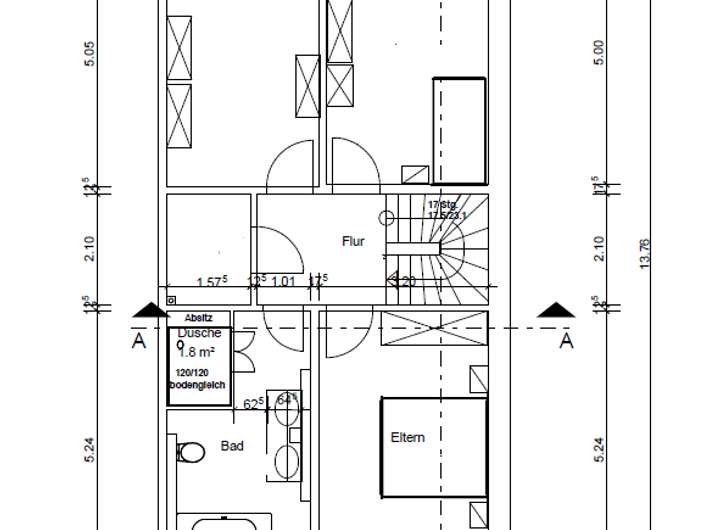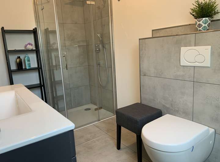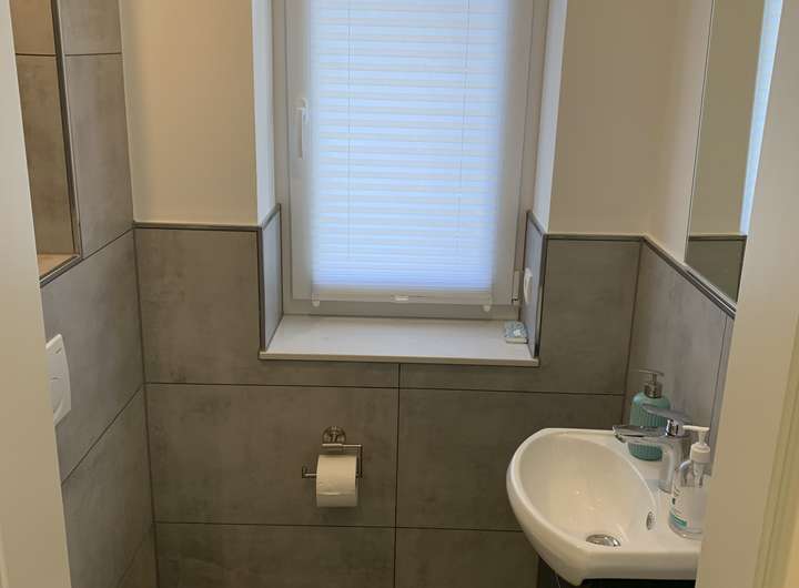 Das Gäste Bad im Dachgeschoss mit Dusche, Toilette, Waschbecken mit Unterbauschrank ermöglicht einen zweiten Rückzugsort für die täglichen Bedürfnisse.