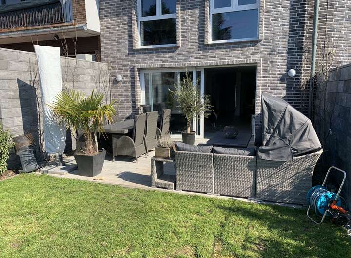 Große Terrasse, pflegeleichter Garten sowie XXL Gartenhaus Massiv.