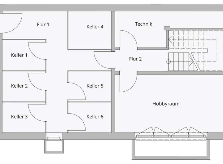 Im Untergeschoss gibt es einen Hobbyraum mit großem Fenster, einen ca. 45 m² großen Abstellraum sowie einen Technikraum mit Stellfläche für Waschmaschine und Trockner.