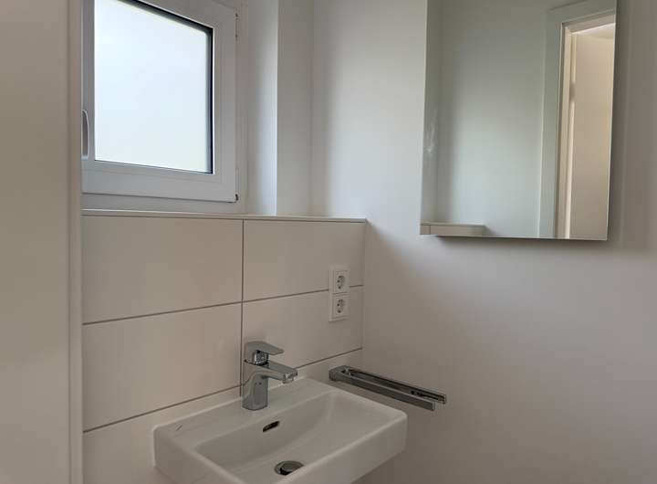 - die Sanitärräume wurden mit großformatigen, weißen Wandfliesen und eleganten, anthrazitfarbenen Bodenfliesen ausgestattet