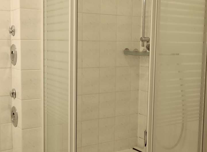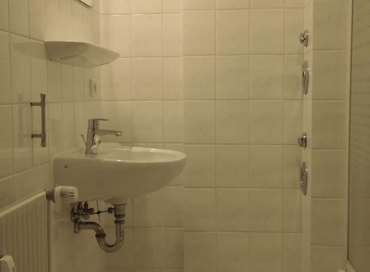 Bad: Waschtisch, WC, Dusche, ca. 2 m umlfd. weiße Wandfliesen