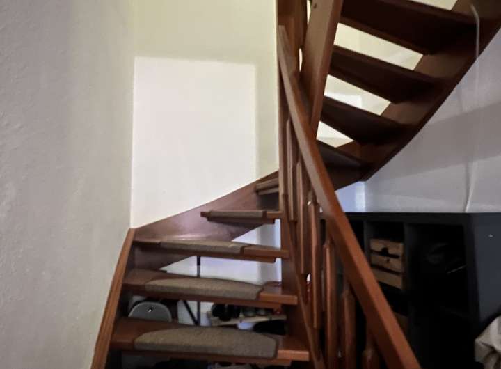 Vom Wohnzimmer führt eine Treppe in das ausgebaute Dachgeschoss.