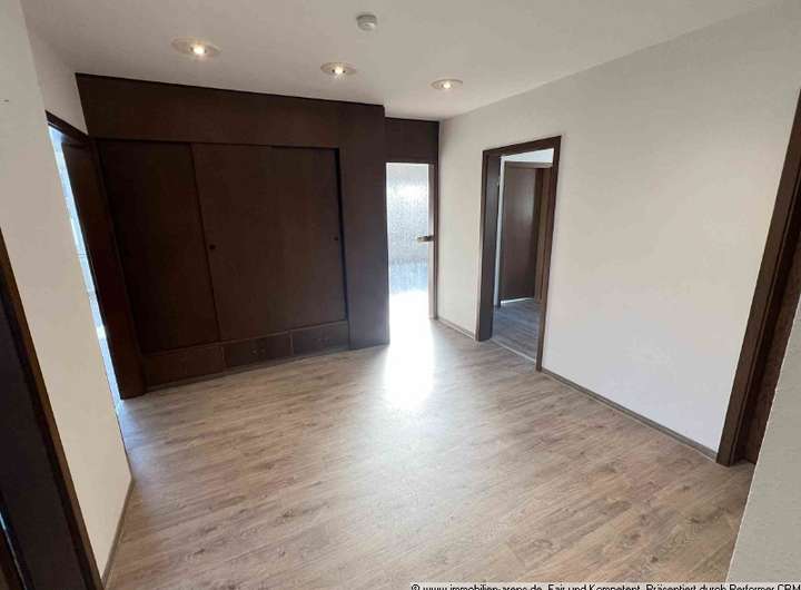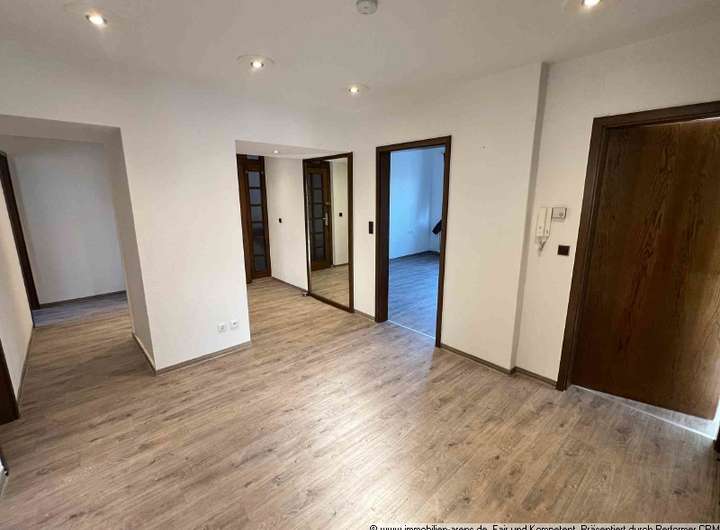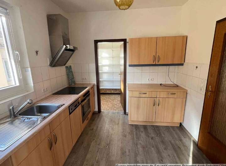 Obergeschosswohnung im 1. OG in einem Wohn- und Geschäftshaus mit einer Gewerbeeinheit und 2 Wohneinheiten. Die Wohnung besteht aus großem, lichtdurchfluteten Wohnzimmer mit angrenzendem Esszimmer und Küche mit Abstellraum sowie Schlafzimmer, Badezimmer, Gäste-WC, Abstellraum, Diele und kleinem Balkon. Die Wohnfläche beträgt rd.100 m². Aufteilung siehe Grundriss.