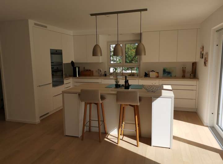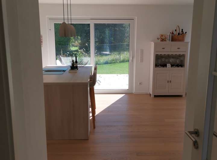 EG: Großer Wohn-Essbereich mit Einbauküche und freistehendem Küchenblock (hochwertige Einbaugeräte der Marke Gaggenau, V-ZUG) und großer Terrassen-Schiebetüre, Büro, heller Flur mit Garderobe, Dusch-WC mit bodentiefer Dusche.
