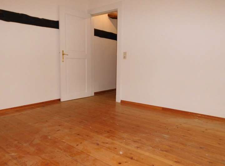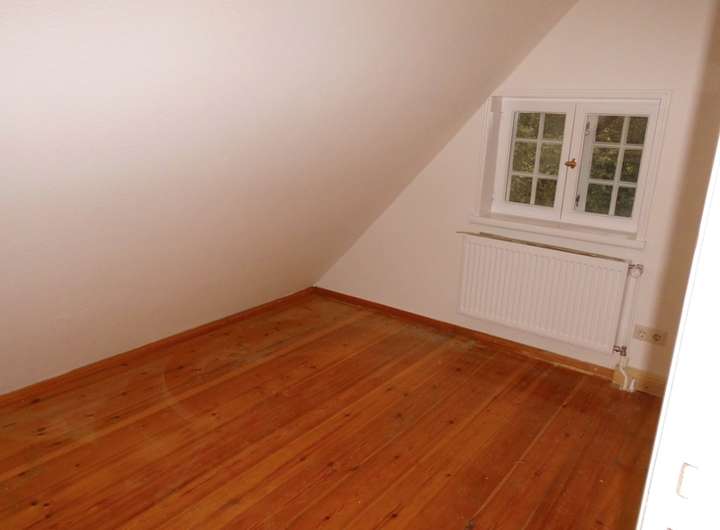 Da das zweite Schlafzimmer im oberen Geschoss unter der Dachschräge liegt, ist es nur als Schlafraum für ein kleines Kind oder für ein Arbeitszimmer geeignet.