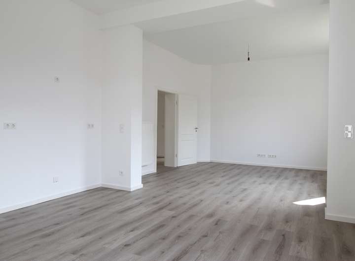 Sie verfügt über einen Flur, einen großzügigen und lichtdurchfluteten Wohn-/Essbereich mit offener Küche (eine Einbauküche ist nicht vorhanden), sowie drei Schlafzimmer, ein Gäste-WC und ein Tageslichtbad mit Eckbadewanne und begehbarer Dusche.