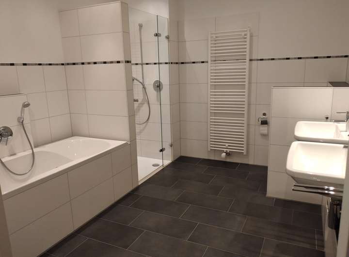 Parkettboden, Diele, Gäste-Bad mit Dusche, WC und WM-Anschluss, Arbeitszimmer, großes Wohnen / Essen mit offenem Küchenbereich (inkl. Einbauküche) und Zugang auf den Südbalkon, Schlafzimmer mit 2 Schränken , Bad mit Dusche, Badewanne, WC und zwei Waschbecken, Aufzug, Kellerraum, Trockenraum, Fahrradraum, Hausmeisterservice, zwei Tiefgaragenstellplätze (Box und Stellplatz)